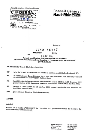 portant modification de la composition des membres du comité départemental des retraités et personnes âgées du Haut-Rhin (C.O.D.E.R.P.A.). Resumé Pièces jointes ARRETE Assemblée : Non défini Date : 16/03/2012 Rapporteur : Non défini Collectivité : Conseil départemental du Haut-Rhin Direction : Non défini Service : Direction de l'Autonomie Domaine : Autres (non classés) Commission :