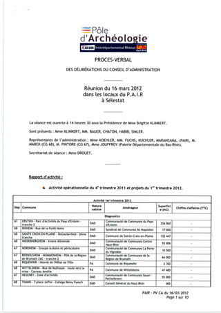 des délibérations du Conseil d'Administration du P.A.I.R. (Pôle d'Archéologie Interdépartemental Rhénan). Réunion du 16.03.2012 Resumé Pièces jointes ARRETE Assemblée : Non défini Date : 16/03/2012 Rapporteur : Non défini Collectivité : Conseil départemental du Haut-Rhin Direction : Non défini Service : Direction Générale Adjointe des Politiques de Proximité, des Grands Equipements et de la Prospective Domaine : Autres (non classés) Commission :