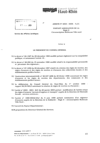 portant abrogation de la régie 8 circonscription Mulhouse ville-nord. Resumé Pièces jointes ARRETE Assemblée : Non défini Date : 20/01/2003 Rapporteur : Non défini Collectivité : Conseil départemental du Haut-Rhin Direction : Non défini Service : Service Juridique Domaine : Autres (non classés) Commission :