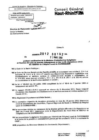 portant notification de la décision d'autorisation budgétaire et fixation des prix de journée hébergement et des tarifs dépendance 2012 de l'EHPAD de l'hôpital local de DANNEMARIE. Resumé Pièces jointes ARRETE Assemblée : Non défini Date : 23/03/2012 Rapporteur : Non défini Collectivité : Conseil départemental du Haut-Rhin Direction : Non défini Service : Direction de l'Autonomie Domaine : Prix de Journée Commission :