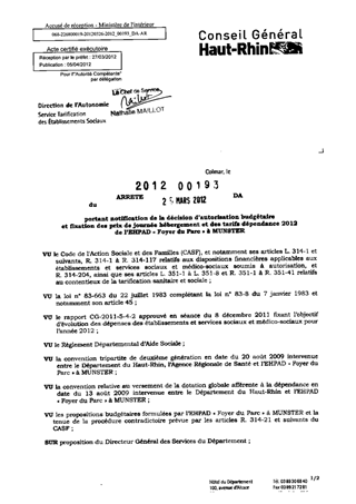 portant notification de la décision d'autorisation budgétaire et fixation des prix de journée hébergement et des tarifs dépendance 2012 de l'EHPAD "Foyer du Parc" à MUNSTER. Resumé Pièces jointes ARRETE Assemblée : Non défini Date : 28/03/2012 Rapporteur : Non défini Collectivité : Conseil départemental du Haut-Rhin Direction : Non défini Service : Direction de l'Autonomie Domaine : Prix de Journée Commission :