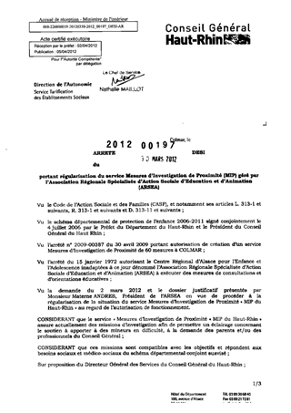 portant régularisation du service mesures d'investigation de proximité (MIP) géré par l'Association Régionale Spécialisée d'Action Sociale d'Education et d'Animation (ARSEA). Resumé Pièces jointes ARRETE Assemblée : Non défini Date : 30/03/2012 Rapporteur : Non défini Collectivité : Conseil départemental du Haut-Rhin Direction : Non défini Service : Direction de l'Autonomie Domaine : Autres (non classés) Commission :
