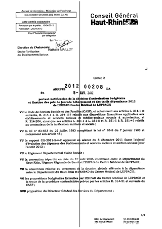 portant notification de la décision d'autorisation budgétaire et fixation des prix de journée hébergement et des tarifs dépendance 2012 de l'EHPAD centre médical de LUPPACH. Resumé Pièces jointes ARRETE Assemblée : Non défini Date : 05/04/2012 Rapporteur : Non défini Collectivité : Conseil départemental du Haut-Rhin Direction : Non défini Service : Direction de l'Autonomie Domaine : Prix de Journée Commission :
