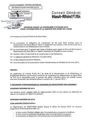 fixant le programme d'actions 2012 pour l'attribution et la gestion des aides de l'ANAH. Resumé Pièces jointes ARRETE Assemblée : Non défini Date : 13/04/2012 Rapporteur : Non défini Collectivité : Conseil départemental du Haut-Rhin Direction : Non défini Service : Service Habitat et Solidarités Territoriales Domaine : Autres (non classés) Commission :