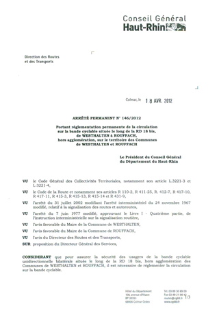 portant réglementation permanente de la circulation sur la bande cyclable située le long de la RD 18 bis, de WESTHALTEN à ROUFFACH, hors agglomération, sur le territoire des communes de WESTHALTEN et ROUFFACH. Resumé Pièces jointes ARRETE Assemblée : Non défini Date : 18/04/2012 Rapporteur : Non défini Collectivité : Conseil départemental du Haut-Rhin Direction : Non défini Service : Direction des Routes Domaine : Circulation Commission :