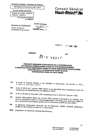 portant demande d'extension de l'autorisation du service prestataire d'aide et d'accompagnement à domicile pour personnes âgées et pour personnes handicapées adultes par la Fédération ADMR Alsace (Fédération ADMR du Haut-Rhin). Resumé Pièces jointes ARRETE Assemblée : Non défini Date : 19/04/2012 Rapporteur : Non défini Collectivité : Conseil départemental du Haut-Rhin Direction : Non défini Service : Direction de l'Autonomie Domaine : Autres (non classés) Commission :