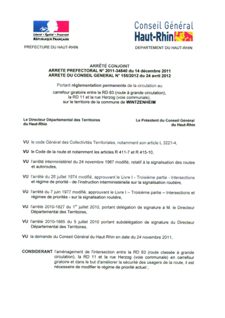portant réglementation permanente de la circulation au carrefour giratoire entre la RD 83 (route à grande circulation), la RD 11 et la rue Herzog (voie communale), sur le territoire de la commune de WINTZENHEIM. Resumé Pièces jointes ARRETE Assemblée : Non défini Date : 24/04/2012 Rapporteur : Non défini Collectivité : Conseil départemental du Haut-Rhin Direction : Non défini Service : Direction des Routes Domaine : Circulation Commission :