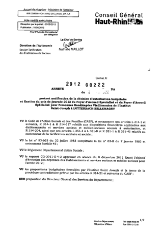 portant notification de la décision d'autorisation budgétaire et fixation du prix de journée 2012 du foyer d'accueil spécialisé et du foyer d'accueil spécialisé pour personnes handicapées vieillissantes de l'Institut St-Joseph à LUTTERBACH-BELLEMAGNY.