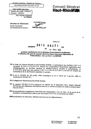 portant notification de la décision d'autorisation budgétaire et fixation du prix de journée 2012 du foyer d'accueil spécialisé de l'association "Arc-en-Ciel" à AUBURE. Resumé Pièces jointes ARRETE Assemblée : Non défini Date : 04/05/2012 Rapporteur : Non défini Collectivité : Conseil départemental du Haut-Rhin Direction : Non défini Service : Direction de l'Autonomie Domaine : Prix de Journée Commission :