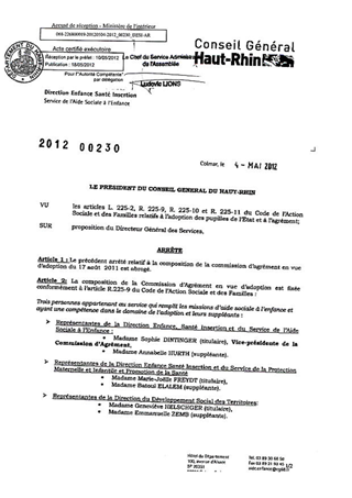 relatif à la composition de la commission d'agrément en vue d'adoption. Resumé Pièces jointes ARRETE Assemblée : Non défini Date : 04/05/2012 Rapporteur : Non défini Collectivité : Conseil départemental du Haut-Rhin Direction : Non défini Service : Direction Enfance Santé Insertion Domaine : Autres (non classés) Commission :