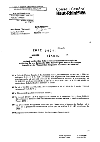 portant notification de la décision d'autorisation budgétaire et fixation du prix de journée 2012 du foyer pour adultes handicapés travailleurs de l'association "Marguerite Sinclair" à MULHOUSE. Resumé Pièces jointes ARRETE Assemblée : Non défini Date : 16/05/2012 Rapporteur : Non défini Collectivité : Conseil départemental du Haut-Rhin Direction : Non défini Service : Direction de l'Autonomie Domaine : Prix de Journée Commission :