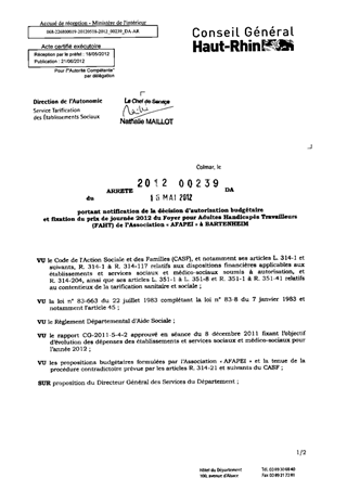 portant notification de la décision d'autorisation budgétaire et fixation du prix de journée 2012 du foyer pour adultes handicapés travailleurs (FAHT) de l'association "AFAPEI" à BARTENHEIM. Resumé Pièces jointes ARRETE Assemblée : Non défini Date : 16/05/2012 Rapporteur : Non défini Collectivité : Conseil départemental du Haut-Rhin Direction : Non défini Service : Direction de l'Autonomie Domaine : Prix de Journée Commission :