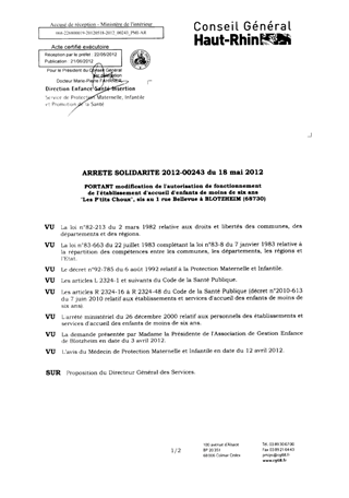 portant modification de l'autorisation de fonctionnement de l'établissement d'accueil d'enfants de moins de six ans "Les P'tits Choux", sis au 1 rue Bellevue à BLOTZHEIM (68730). Resumé Pièces jointes ARRETE Assemblée : Non défini Date : 18/05/2012 Rapporteur : Non défini Collectivité : Conseil départemental du Haut-Rhin Direction : Non défini Service : Direction Enfance Santé Insertion Domaine : Accueil d'enfants Commission :
