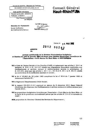 portant notification de la décision d'autorisation budgétaire et fixation du prix de journée 2012 du foyer pour adultes handicapés travailleurs de l'association "Croix Marine du Haut-Rhin" à WITTENHEIM. Resumé Pièces jointes ARRETE Assemblée : Non défini Date : 24/05/2012 Rapporteur : Non défini Collectivité : Conseil départemental du Haut-Rhin Direction : Non défini Service : Direction de l'Autonomie Domaine : Prix de Journée Commission :