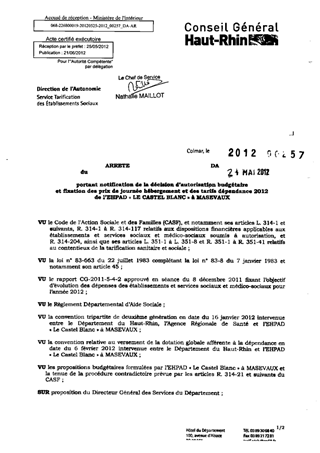 portant notification de la décision d'autorisation budgétaire et fixation des prix de journée hébergement et des tarifs dépendance 2012 de l'EHPAD "Le Castel Blanc" à MASEVAUX. Resumé Pièces jointes ARRETE Assemblée : Non défini Date : 24/05/2012 Rapporteur : Non défini Collectivité : Conseil départemental du Haut-Rhin Direction : Non défini Service : Direction de l'Autonomie Domaine : Prix de Journée Commission :