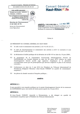 portant ouverture de l'enquête publique sur le projet d'opération d'aménagement foncier sur le territoire de la commune de DANNEMARIE. Resumé Pièces jointes ARRETE Assemblée : Non défini Date : 25/05/2012 Rapporteur : Non défini Collectivité : Conseil départemental du Haut-Rhin Direction : Non défini Service : Direction de l'Environnement et du Cadre de Vie Domaine : Autres (non classés) Commission :