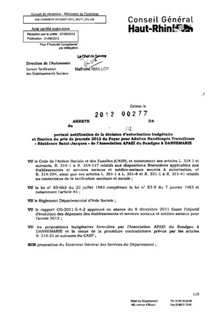 portant notification de la décision d'autorisation budgétaire et fixation du prix de journée 2012 du foyer pour adultes handicapés travailleurs "Résidence Saint-Jacques" de l'association APAEI du Sundgau à DANNEMARIE. Resumé Pièces jointes ARRETE Assemblée : Non défini Date : 05/06/2012 Rapporteur : Non défini Collectivité : Conseil départemental du Haut-Rhin Direction : Non défini Service : Direction de l'Autonomie Domaine : Prix de Journée Commission :