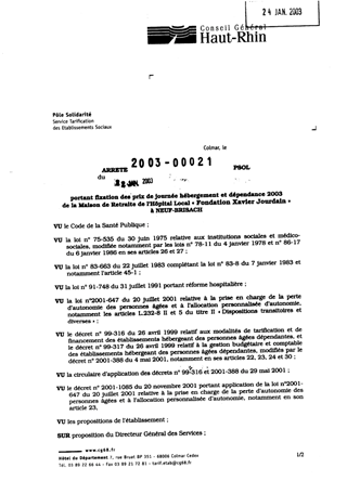 portant fixation des prix de journée hébergement et dépendance 2003 de la Maison de Retraite de l'Hôpital Local "Fondation Xavier Jourdain" à NEUF-BRISACH. Resumé Pièces jointes ARRETE Assemblée : Non défini Date : 22/01/2003 Rapporteur : Non défini Collectivité : Conseil départemental du Haut-Rhin Direction : Non défini Service : Direction de la Solidarité Domaine : Prix de Journée Commission :