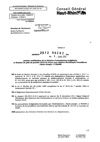 portant notification de la décision d'autorisation budgétaire et fixation du prix de journée 2012 du foyer pour adultes handicapés travailleurs "Saint-Joseph" à THANN. Resumé Pièces jointes ARRETE Assemblée : Non défini Date : 13/06/2012 Rapporteur : Non défini Collectivité : Conseil départemental du Haut-Rhin Direction : Non défini Service : Direction de l'Autonomie Domaine : Prix de Journée Commission :