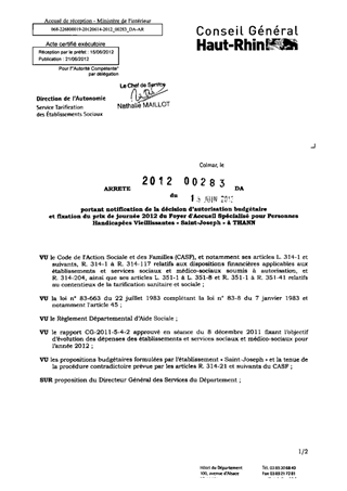 portant notification de la décision d'autorisation budgétaire et fixation du prix de journée 2012 du foyer foyer d'accueil spécialisé pour personnes handicapées vieillissantes "Saint-Joseph" à THANN. Resumé Pièces jointes ARRETE Assemblée : Non défini Date : 13/06/2012 Rapporteur : Non défini Collectivité : Conseil départemental du Haut-Rhin Direction : Non défini Service : Direction de l'Autonomie Domaine : Prix de Journée Commission :
