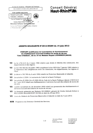 portant modification de l'autorisation de fonctionnement de l'établissement d'accueil d'enfants de moins de six ans "Coeur d'Enfants", sis au 10 rue Madame Royale à HUNINGUE (68330). Resumé Pièces jointes ARRETE Assemblée : Non défini Date : 14/06/2012 Rapporteur : Non défini Collectivité : Conseil départemental du Haut-Rhin Direction : Non défini Service : Direction Enfance Santé Insertion Domaine : Accueil d'enfants Commission :