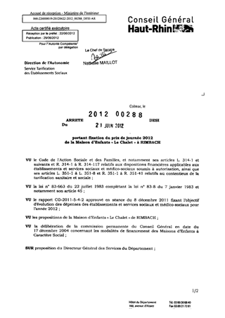 portant fixatiion du prix de journée 2012 de la Maison d'Enfants "Le Chalet" à RIMBACH. Resumé Pièces jointes ARRETE Assemblée : Non défini Date : 21/06/2012 Rapporteur : Non défini Collectivité : Conseil départemental du Haut-Rhin Direction : Non défini Service : Direction de l'Autonomie Domaine : Prix de Journée Commission :