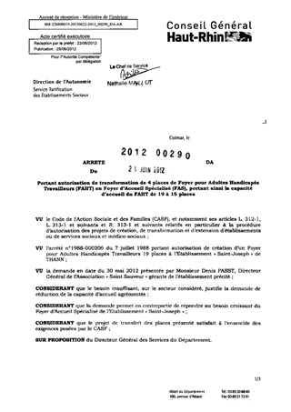 portant autorisation de transformation de 4 places de foyer pour adultes handicapés travailleurs (FAHT) en foyer d'accueil spécialisé (FAS), portant ainsi la capacité d'accueil du FAHT de 19 à 15 places. Resumé Pièces jointes ARRETE Assemblée : Non défini Date : 21/06/2012 Rapporteur : Non défini Collectivité : Conseil départemental du Haut-Rhin Direction : Non défini Service : Direction de l'Autonomie Domaine : Autres (non classés) Commission :