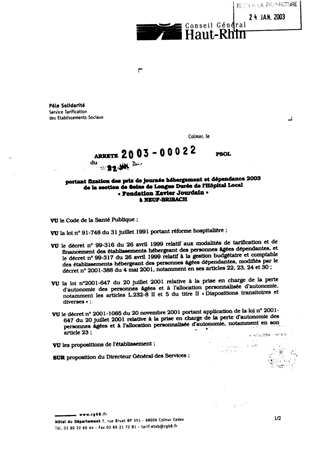 portant fixation des prix de journée hébergement et dépendance 2003 de la section de soins de longue durée de l'hôpital local "Fondation Xavier Jourdain" à NEUF BRISACH. Resumé Pièces jointes ARRETE Assemblée : Non défini Date : 22/01/2003 Rapporteur : Non défini Collectivité : Conseil départemental du Haut-Rhin Direction : Non défini Service : Direction de la Solidarité Domaine : Prix de Journée Commission :