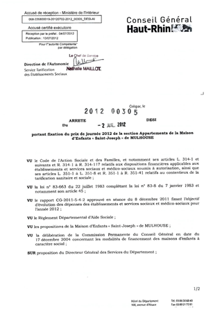 portant fixation du prix de journée 2012 de la section Appartements de la Maison d'Enfants "Saint-Joseph" de MULHOUSE. Resumé Pièces jointes ARRETE Assemblée : Non défini Date : 02/07/2012 Rapporteur : Non défini Collectivité : Conseil départemental du Haut-Rhin Direction : Non défini Service : Direction de l'Autonomie Domaine : Prix de Journée Commission :