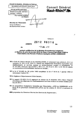 portant notification de la décision d'autorisation budgétaire et fixation des prix de journée 2012 du foyer d'accueil spécialisé (FAS) de l'association des parents d'enfants inadaptés (APEI) à HIRSINGUE. Resumé Pièces jointes ARRETE Assemblée : Non défini Date : 05/07/2012 Rapporteur : Non défini Collectivité : Conseil départemental du Haut-Rhin Direction : Non défini Service : Direction de l'Autonomie Domaine : Prix de Journée Commission :