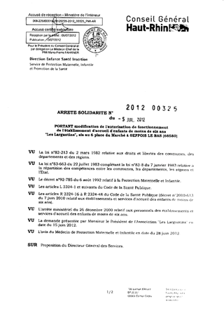 portant modification de l'autorisation de fonctionnement de l'établissement d'accueil d'enfants de moins de six ans "Les Larguotins", sis au 6 place du Marché à SEPPOIS LE BAS (68580) Resumé Pièces jointes ARRETE Assemblée : Non défini Date : 05/07/2012 Rapporteur : Non défini Collectivité : Conseil départemental du Haut-Rhin Direction : Non défini Service : Direction Enfance Santé Insertion Domaine : Accueil d'enfants Commission :