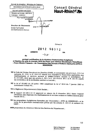 portant notification de la décision d'autorisation budgétaire et fixation du prix de journée 2012 du foyer pour adultes handicapés travailleurs "Foyer Studio l'Annexe" de l'association des parents d'enfants inadaptés (APEI) à HIRSINGUE. Resumé Pièces jointes ARRETE Assemblée : Non défini Date : 05/07/2012 Rapporteur : Non défini Collectivité : Conseil départemental du Haut-Rhin Direction : Non défini Service : Direction de l'Autonomie Domaine : Prix de Journée Commission :