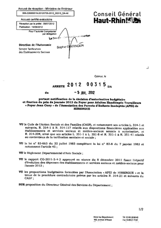 portant notification de la décision d'autorisation budgétaire et fixation des prix de journée 2012 du foyer pour adultes handicapés travailleurs "foyer Jean Cuny" de l'association des parents d'enfants inadaptés (APEI) de HIRSINGUE. Resumé Pièces jointes ARRETE Assemblée : Non défini Date : 05/07/2012 Rapporteur : Non défini Collectivité : Conseil départemental du Haut-Rhin Direction : Non défini Service : Direction de l'Autonomie Domaine : Prix de Journée Commission :