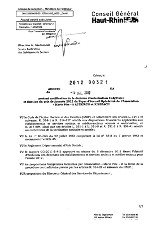 portant notification de la décision d'autorisation budgétaire et fixation du prix de journée 2012 du foyer d'accueil spécialisé de l'association "Marie Pire" à ALTKIRCH et RIESPACH. Resumé Pièces jointes ARRETE Assemblée : Non défini Date : 05/07/2012 Rapporteur : Non défini Collectivité : Conseil départemental du Haut-Rhin Direction : Non défini Service : Direction de l'Autonomie Domaine : Prix de Journée Commission :