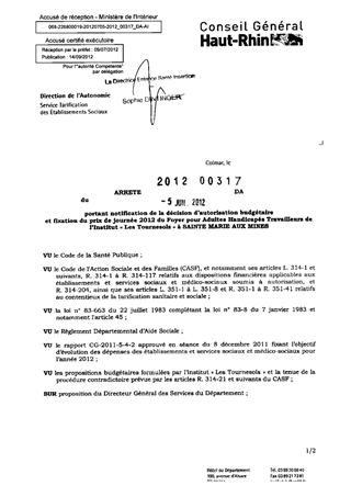 portant notification de la décision d'autorisation budgétaire et fixation du prix de journée 2012 du foyer pour adultes handicapés travailleurs de l'Institut "Les Tournesols" à SAINTE MARIE AUX MINES. Resumé Pièces jointes ARRETE Assemblée : Non défini Date : 05/07/2012 Rapporteur : Non défini Collectivité : Conseil départemental du Haut-Rhin Direction : Non défini Service : Direction de l'Autonomie Domaine : Prix de Journée Commission :