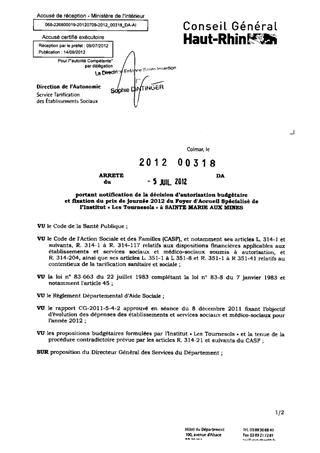 portant notification de la décision d'autorisation budgétaire et fixation du prix de journée 2012 du foyer d'accueil spécialisé de l'Institut "Les Tournesols" à SAINTE MARIE AUX MINES. Resumé Pièces jointes ARRETE Assemblée : Non défini Date : 05/07/2012 Rapporteur : Non défini Collectivité : Conseil départemental du Haut-Rhin Direction : Non défini Service : Direction de l'Autonomie Domaine : Prix de Journée Commission :