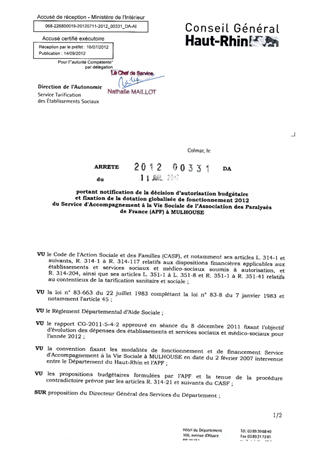 portant notification de la décision d'autorisation budgétaire et fixation de la dotation globalisée de fonctionnement 2012 du service d'accompagnement à la vie sociale de l'Association des Paralysés de France (APF) à MULHOUSE. Resumé Pièces jointes ARRETE Assemblée : Non défini Date : 11/07/2012 Rapporteur : Non défini Collectivité : Conseil départemental du Haut-Rhin Direction : Non défini Service : Direction de l'Autonomie Domaine : Dotations financières Commission :