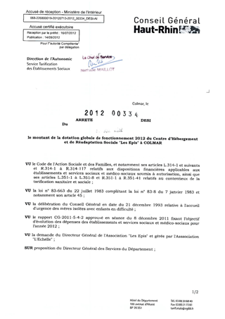 fixant le montant de la dotation globale de fonctionnement 2012 du centre d'hébergement et de réadaptation sociale "Les Epis" à COLMAR. Resumé Pièces jointes ARRETE Assemblée : Non défini Date : 13/07/2012 Rapporteur : Non défini Collectivité : Conseil départemental du Haut-Rhin Direction : Non défini Service : Direction de l'Autonomie Domaine : Dotations financières Commission :