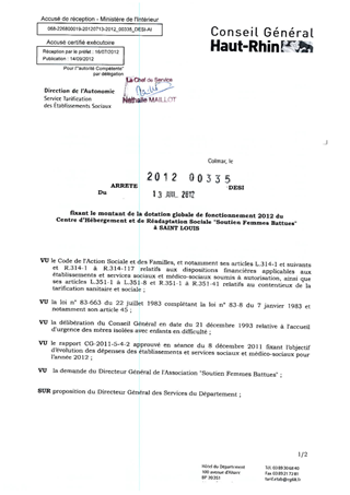 fixant le montant de la dotation globale de fonctionnement 2012 du centre d'hébergement et de réadaptation sociale "Soutien Femmes Battues" à SAINT-LOUIS. Resumé Pièces jointes ARRETE Assemblée : Non défini Date : 13/07/2012 Rapporteur : Non défini Collectivité : Conseil départemental du Haut-Rhin Direction : Non défini Service : Direction de l'Autonomie Domaine : Dotations financières Commission :