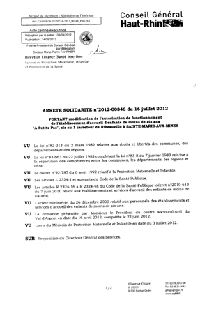 portant modification de l'autorisation de fonctionnement de l'établissement d'accueil d'enfants de moins de six ans "A Petits Pas", sis au 1 carrefour de Ribeauvillé à SAINTE MARIE AUX MINES. Resumé Pièces jointes ARRETE Assemblée : Non défini Date : 16/07/2012 Rapporteur : Non défini Collectivité : Conseil départemental du Haut-Rhin Direction : Non défini Service : Direction Enfance Santé Insertion Domaine : Accueil d'enfants Commission :