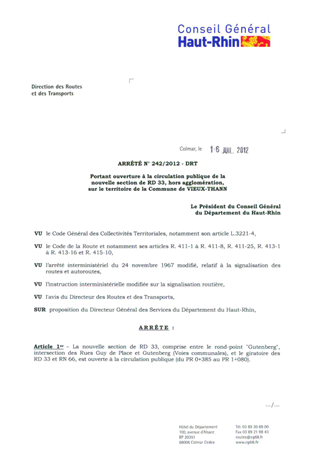 portant ouverture à la circulation publique de la nouvelle section de RD 33, hors agglomération, sur le territoire de la commune de VIEUX-THANN. Resumé Pièces jointes ARRETE Assemblée : Non défini Date : 16/07/2012 Rapporteur : Non défini Collectivité : Conseil départemental du Haut-Rhin Direction : Non défini Service : Direction des Routes Domaine : Circulation Commission :