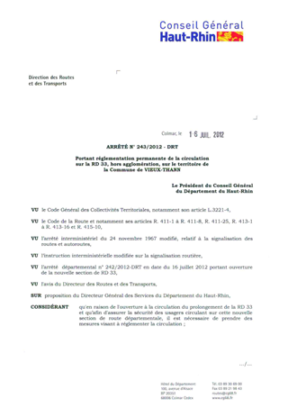 portant réglementation permanente de la circulation sur la RD 33, hors agglomération, sur le territoire de la commune de VIEUX-THANN. Resumé Pièces jointes ARRETE Assemblée : Non défini Date : 16/07/2012 Rapporteur : Non défini Collectivité : Conseil départemental du Haut-Rhin Direction : Non défini Service : Direction des Routes Domaine : Circulation Commission :