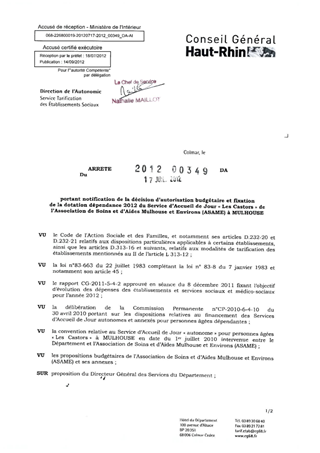 portant notification de la décision d'autorisation budgétaire et fixation de la dotation dépendance 2012 du service d'accueil de jour "Les Castors" de l'association de soins et d'aides Mulhouse et Environs (ASAME) à MULHOUSE. Resumé Pièces jointes ARRETE Assemblée : Non défini Date : 17/07/2012 Rapporteur : Non défini Collectivité : Conseil départemental du Haut-Rhin Direction : Non défini Service : Direction de l'Autonomie Domaine : Dotations financières Commission :