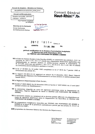 portant notification de la décision d'autorisation budgétaire et fixation des tarifs dépendance 2012 de l'EHPAD "Les Fontaines de Kembs" à KEMBS. Resumé Pièces jointes ARRETE Assemblée : Non défini Date : 23/07/2012 Rapporteur : Non défini Collectivité : Conseil départemental du Haut-Rhin Direction : Non défini Service : Direction de l'Autonomie Domaine : Dotations financières Commission :