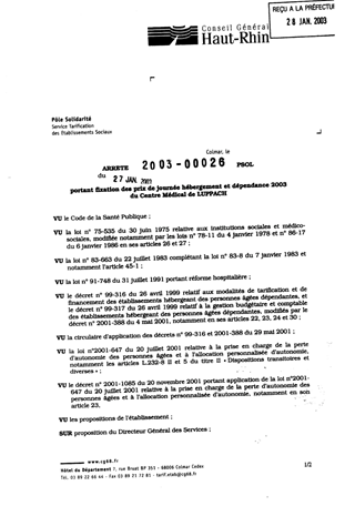 portant fixation des prix de journée hébergement et dépendance 2003 du centre médical de LUPPACH. Resumé Pièces jointes ARRETE Assemblée : Non défini Date : 27/01/2003 Rapporteur : Non défini Collectivité : Conseil départemental du Haut-Rhin Direction : Non défini Service : Direction de la Solidarité Domaine : Prix de Journée Commission :