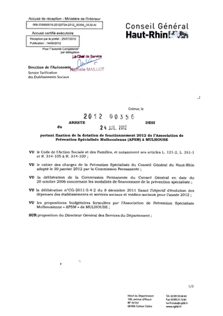 portant fixation de la dotation de fonctionnement 2012 de l'Association de Prévention Spécialisée Mulhousienne (APSM) à MULHOUSE. Resumé Pièces jointes ARRETE Assemblée : Non défini Date : 24/07/2012 Rapporteur : Non défini Collectivité : Conseil départemental du Haut-Rhin Direction : Non défini Service : Direction de l'Autonomie Domaine : Dotations financières Commission :
