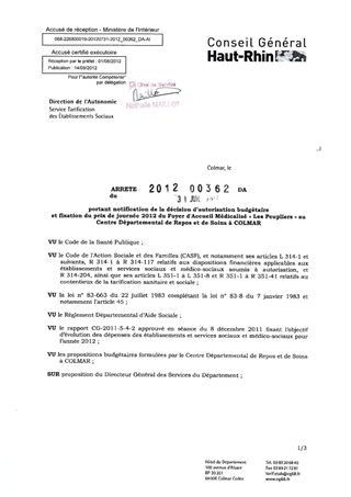 portant notification de la décision d'autorisation budgétaire et fixation du prix de journée 2012 du foyer d'accueil médicalisé "Les Peupliers" au Centre Départemental de Repos et de Soins à COLMAR. Resumé Pièces jointes ARRETE Assemblée : Non défini Date : 31/07/2012 Rapporteur : Non défini Collectivité : Conseil départemental du Haut-Rhin Direction : Non défini Service : Direction de l'Autonomie Domaine : Prix de Journée Commission :