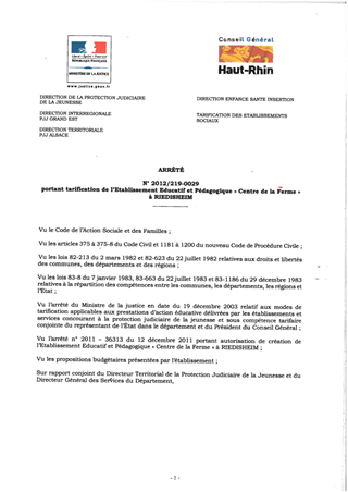 portant tarification de l'établissement éducatif et pédagogique "Centre de la Ferme" à RIEDISHEIM. Resumé Pièces jointes ARRETE Assemblée : Non défini Date : 06/08/2012 Rapporteur : Non défini Collectivité : Conseil départemental du Haut-Rhin Direction : Non défini Service : Direction Enfance Santé Insertion Domaine : Dotations financières Commission :