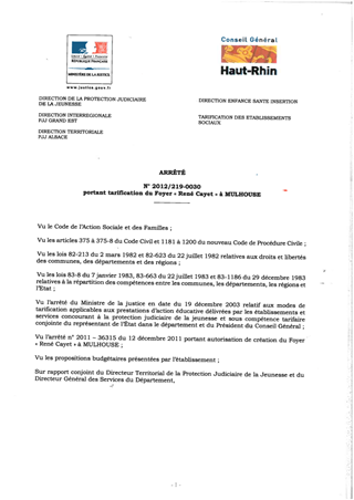 portant tarification du foyer "René Cayet" à MULHOUSE. Resumé Pièces jointes ARRETE Assemblée : Non défini Date : 06/08/2012 Rapporteur : Non défini Collectivité : Conseil départemental du Haut-Rhin Direction : Non défini Service : Direction Enfance Santé Insertion Domaine : Dotations financières Commission :