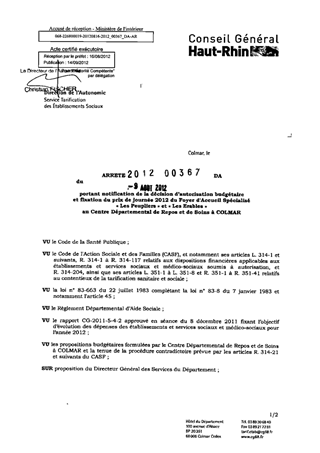 portant notification de la décision d'autorisation budgétaire et fixation du prix de journée 2012 du foyer d'accueil spécialisé "Les Peupliers" et "Les Erables" au centre départemental de repos et de soins à COLMAR. Resumé Pièces jointes ARRETE Assemblée : Non défini Date : 09/08/2012 Rapporteur : Non défini Collectivité : Conseil départemental du Haut-Rhin Direction : Non défini Service : Direction de l'Autonomie Domaine : Prix de Journée Commission :